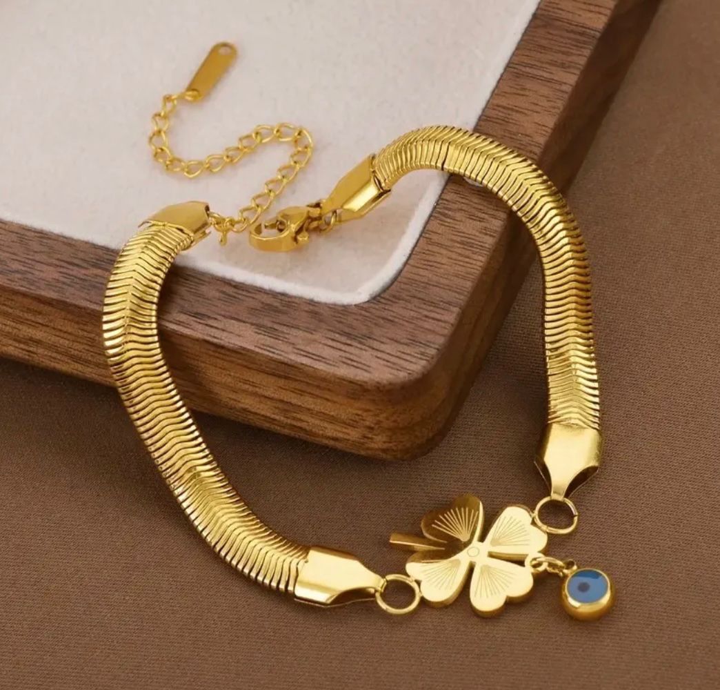 EVIL'S EYE LEAF CHARM SNAKE CHAIN BRACELET