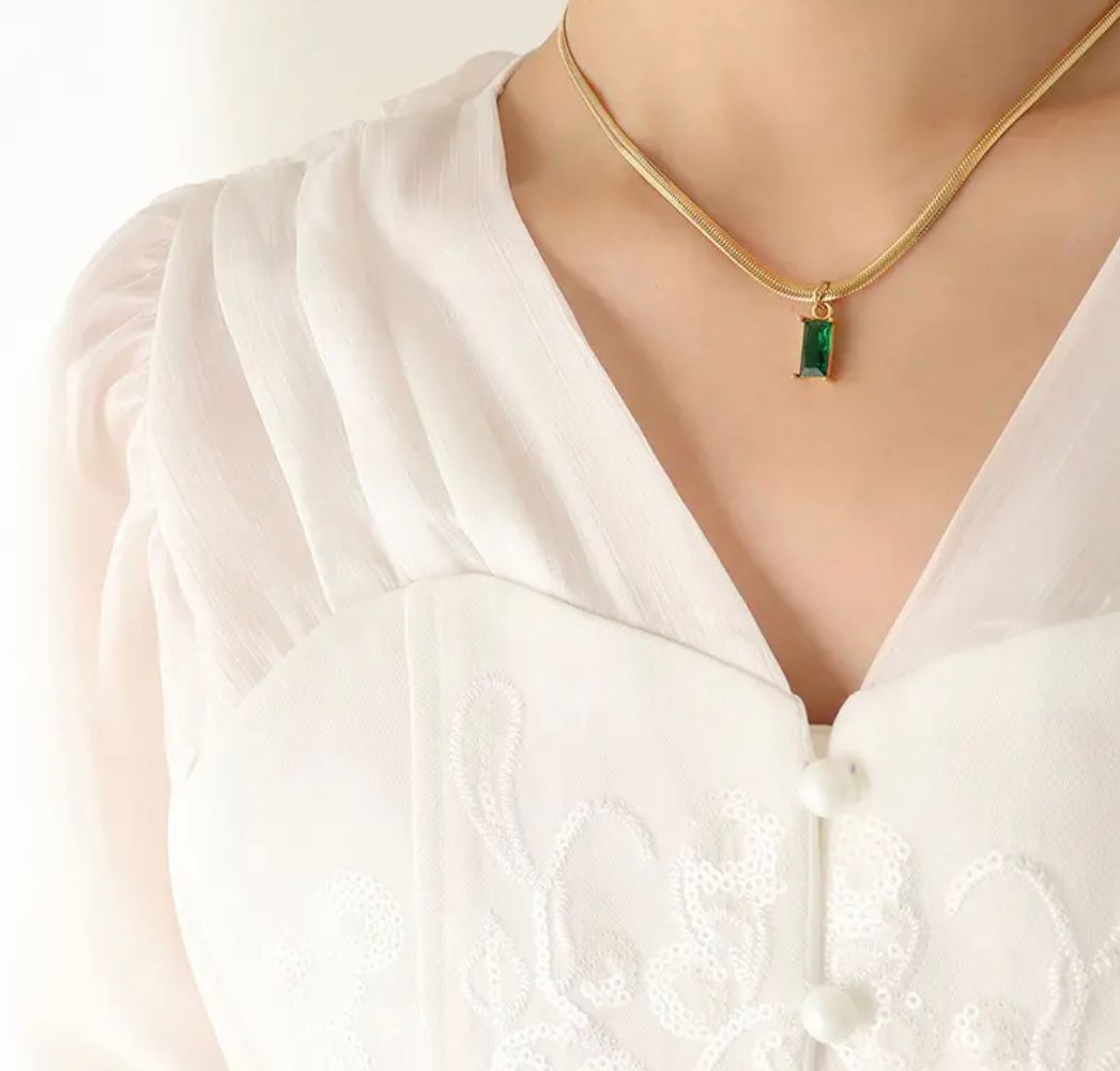 GREEN CUBIC ZIRCONIA CZ FLAT SNAKE CHAIN NECKLACE
